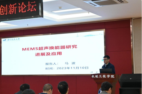 活动中,华中科技大学机械科学与工程学院马波教授以“MEMS超声换能器研究发展及其应用”为主题,从MEMS超声换能器的前沿技术到超声传感模块市场分布、CMUT和PMUT技术发展和现状,以及CMUT在未来超声、血管内窥镜、双模诊疗内窥镜、光声成像、无线超声胶囊、化学传感器、热声成像、植物根须成像、深海探测和非接触探测等方面的应用,为师生带来了一场内容丰富的专题讲座。